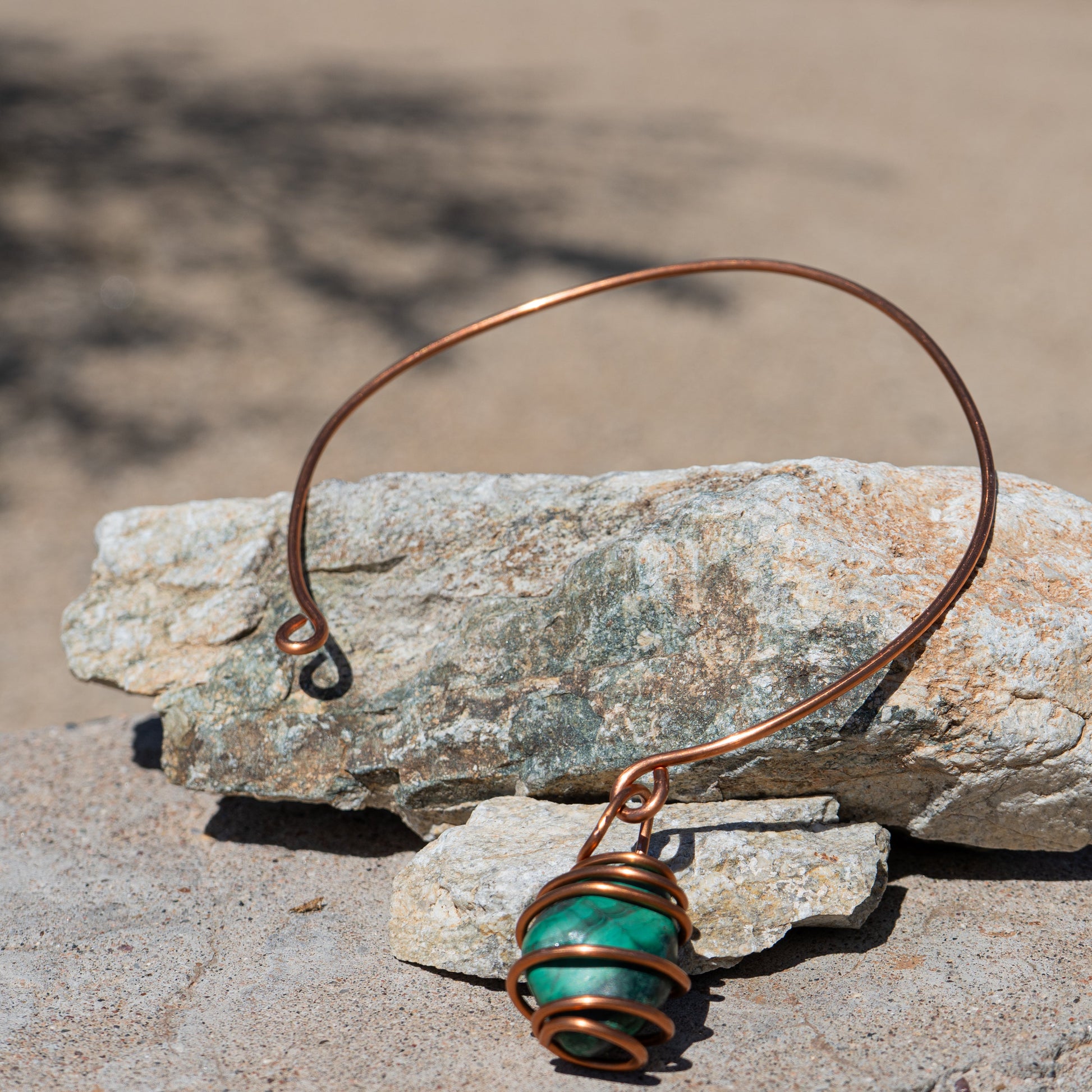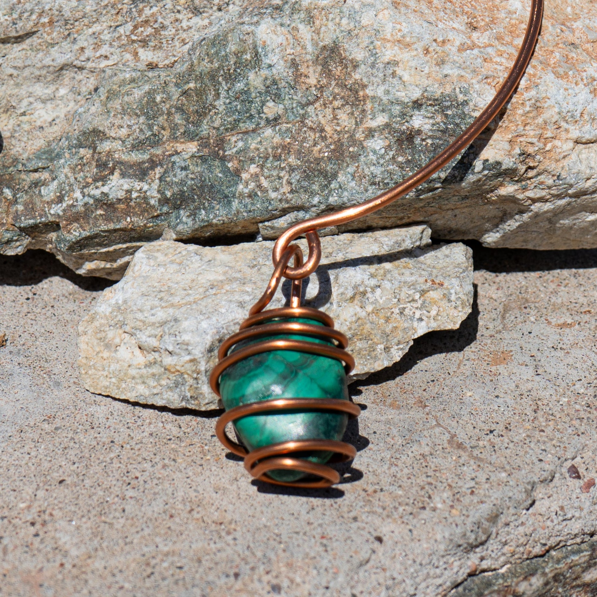 A powerful combination of art and energy, this copper wire choker cradles a stunning malachite pendant. Known for transformation and protection, malachite pairs beautifully with the warm glow of copper for a bold, healing accessory.